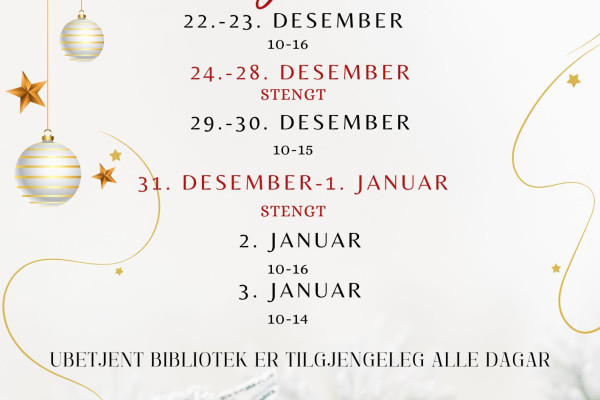 Biblioteket skal ha personalsamling fredag 9. januar, difor er opningstida kl. 12:00-16:00 denne dagen. Meirope er tilgjengeleg frå kl. 16:00.