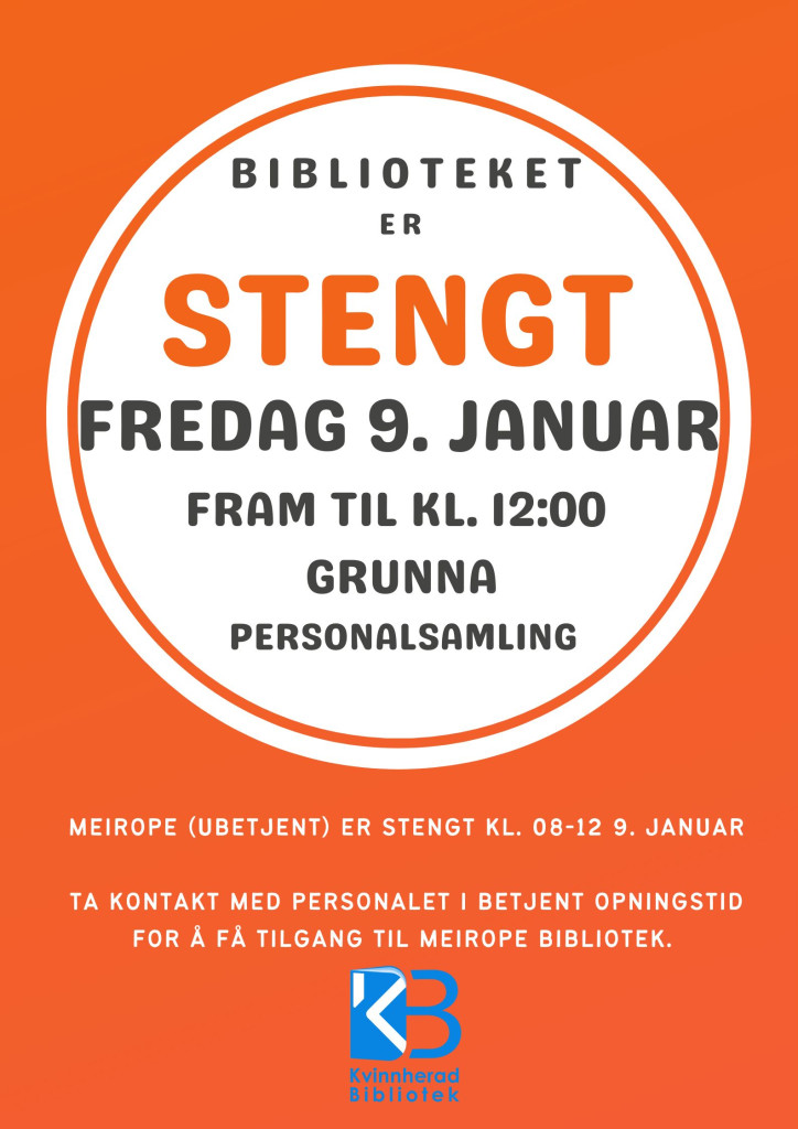 Grunna personalsamling vert biblioteket stengt fredag 9. januar fram til kl. 12:00. Opningstida denne dagen er kl. 12:00-16:00.